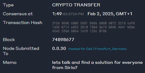 El equipo de Sirio Finance ha contactado con el hacker, aunque aún no han recibido respuesta. Le enviaron una transacción con un MEMO para llegar a un acuerdo.