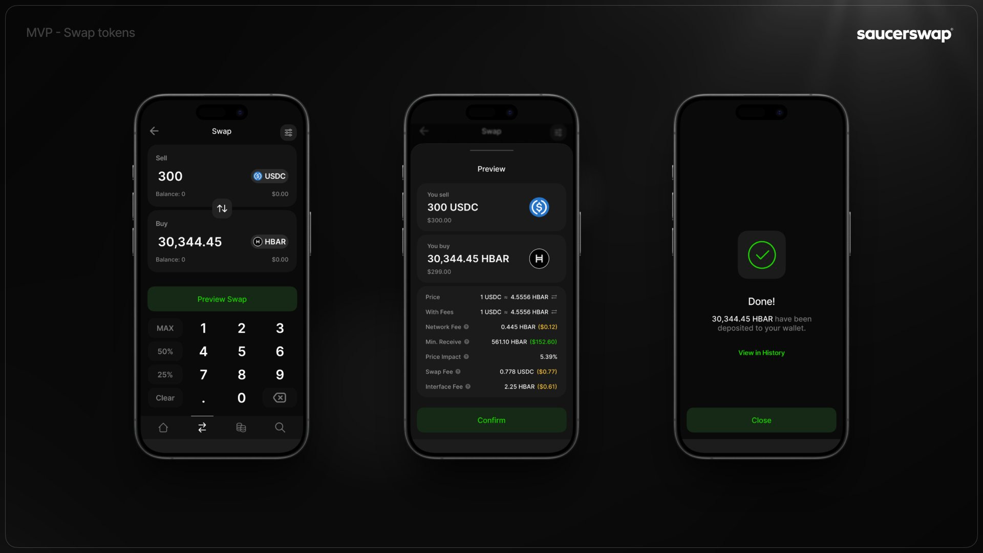 La app viene con un monedero integrado para que uses SaucerSwap como un DEX completo, con funciones para enviar y recibir tokens, soporte para firmas seguras (ECDSA) y un diseño que va de la mano con el nuevo sitio web. ¡Será súper fácil de usar!