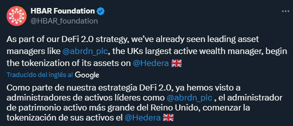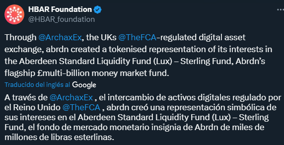 Bien. Esta noticia se hacía eco de que ABRDN comenzó a tokenizar activos en Hedera. Pero hay más: