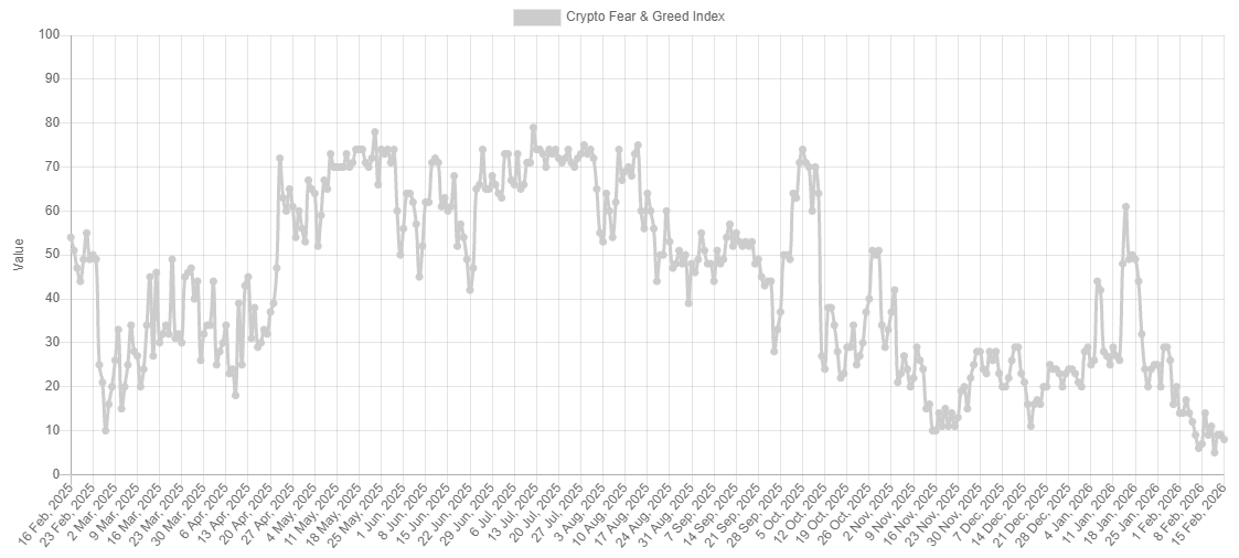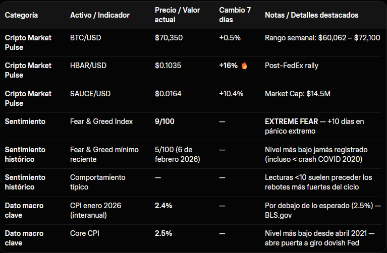 El Fear & Greed Index marcó 5 la semana pasada, su mínimo histórico absoluto. Hoy se mantiene en 9. Para contextualizar: durante el colapso de FTX en 2022, el mínimo fue 6. Estamos, por sentimiento, en territorio peor que cualquier catástrofe previa del mercado cripto. Y sin embargo, bajo la superficie, los datos on-chain nos pueden dar pistas interesantes. Vamos a verlas.